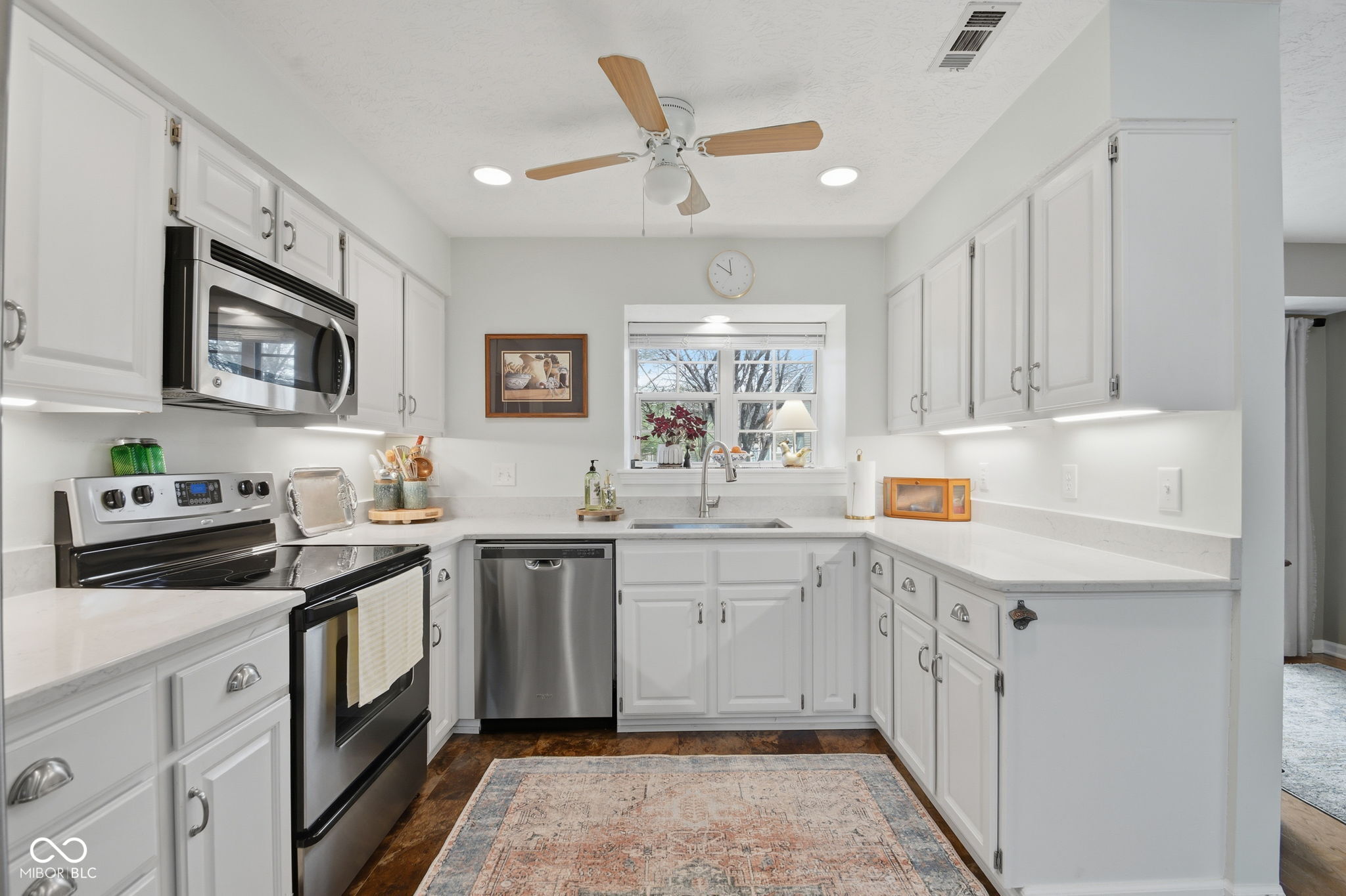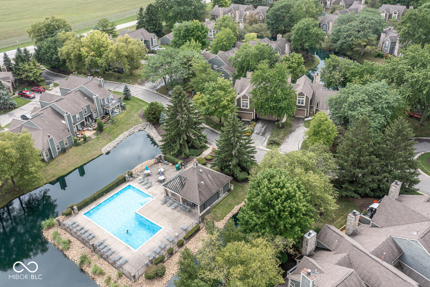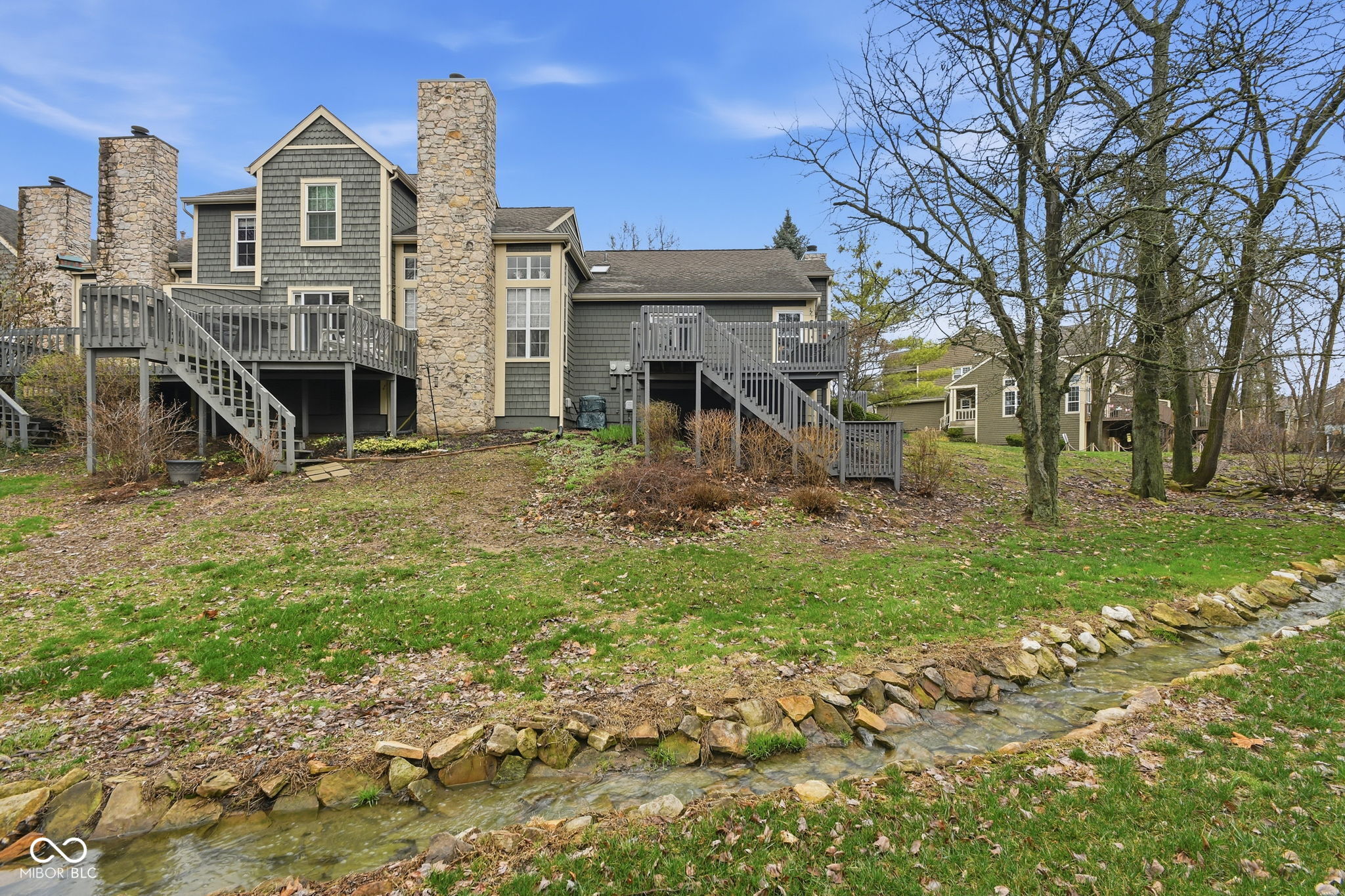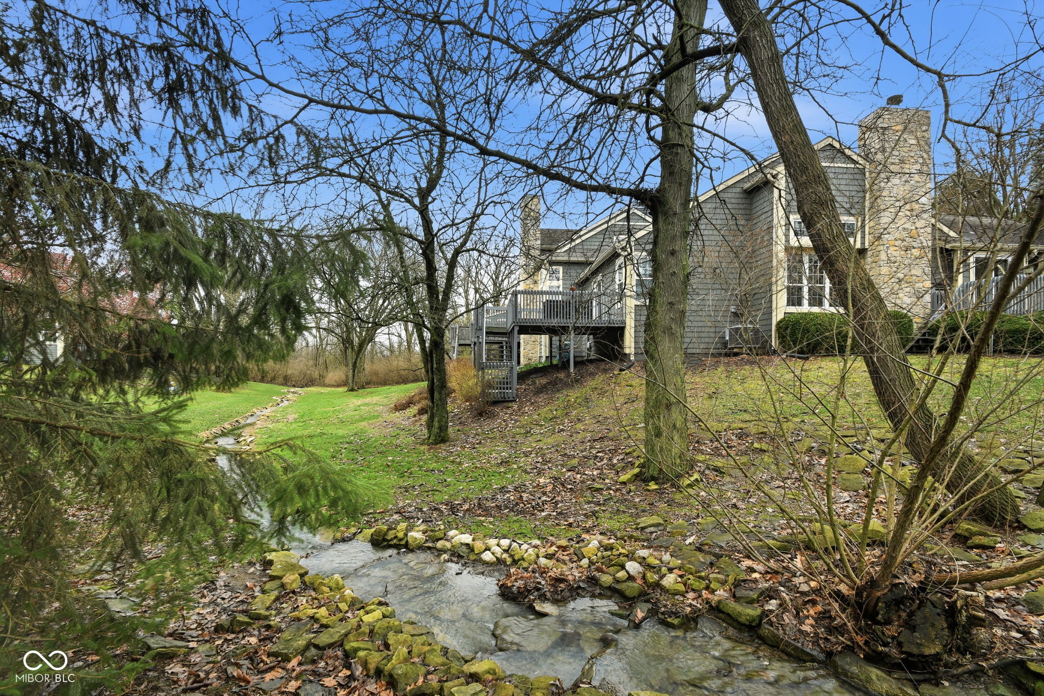 Rare one level end unit in the Cobblestone community near Eagle Creek. This immaculately maintained two bedroom, two bath home offers the convenience of single level living paired with architectural character and thoughtful updates throughout. The layout flows naturally from the living area into the dining and kitchen areas, creating a comfortable setting for both everyday living and entertaining. The kitchen offers bright cabinetry, stainless appliances, generous counter space, and new luxury vinyl flooring. Several meaningful improvements have already been completed, including new windows and sliding doors, a remodeled guest bathroom, new dishwasher, refrigerator, and hot water heater. The attached two car garage offers additional storage with built in cabinetry and durable epoxy style flooring. Two wood decks extend the living space outdoors and provide a quiet setting surrounded by a babbling brook and mature landscaping. Cobblestone residents enjoy access to the community pool and the convenience of nearby Eagle Creek Park, the reservoir, and quick access to I 465 and I 65. Guest parking located across the cul de sac adds additional convenience for visitors.
